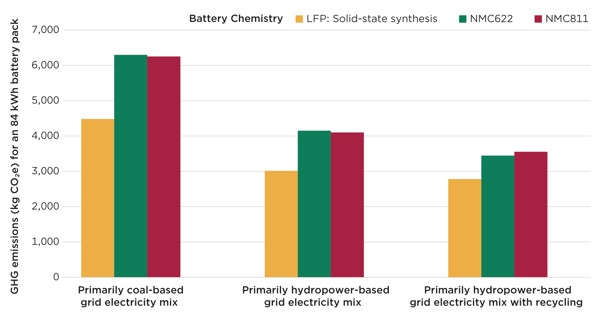 Figure: Life-cycle analysis of battery chemistries produced in different electricity grid scenarios